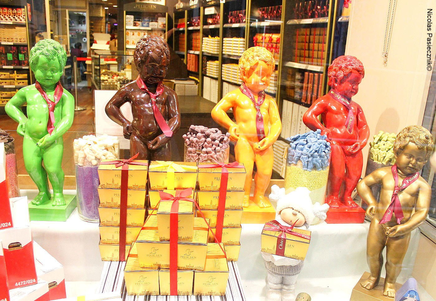 Lo cierto es que la figura del Mannekin Pis no sólo se la puede ver en la fuente ubicada en la intersección de las dos importantes calles sino, además, en los numerosos negocios que están alrededor y que la utilizaron como musa inspiradora para convertirse en la cara de heladerías, bombonerías, restaurantes, pizzerías o cafés.
