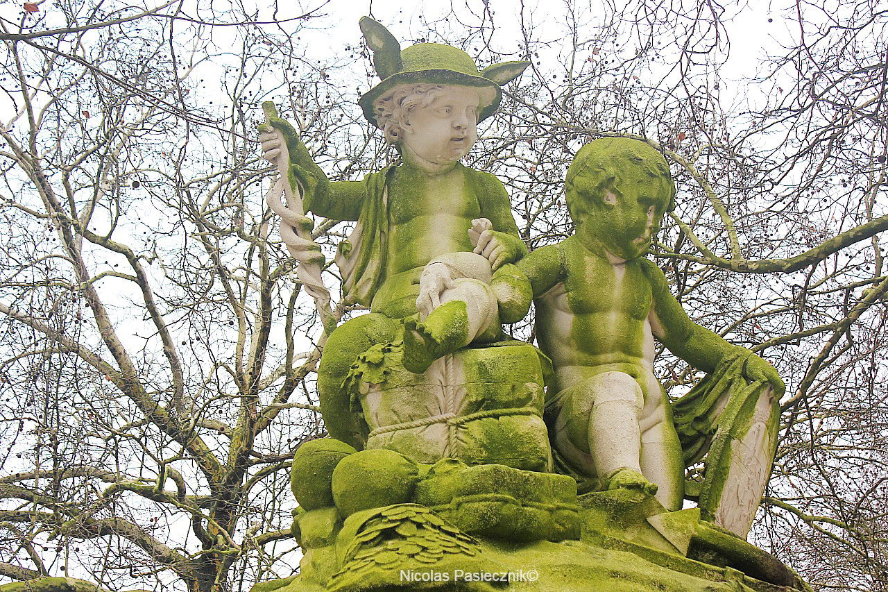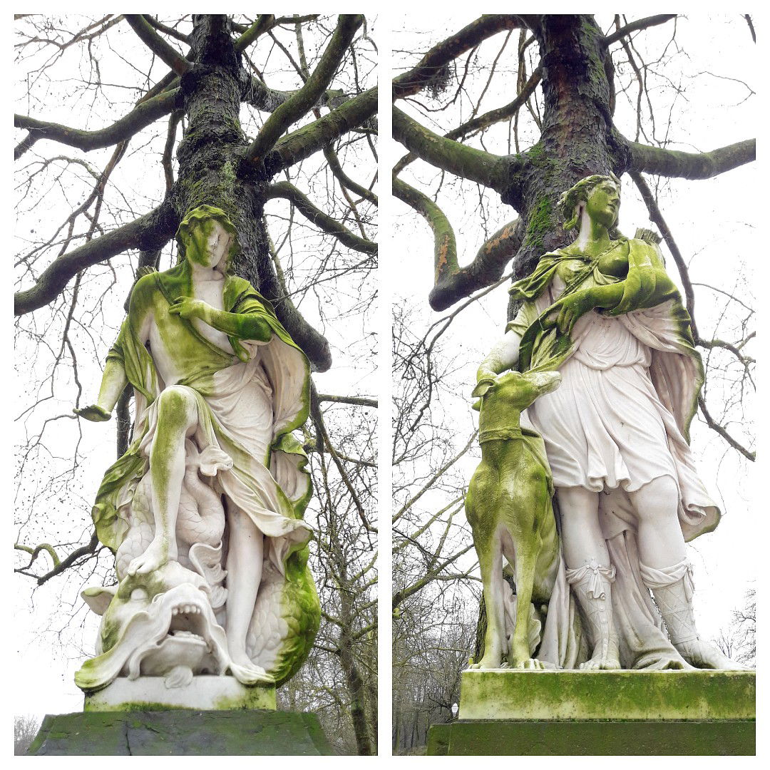 Esculturas de estilo grecorromano abundan en todo el perímetro del parque