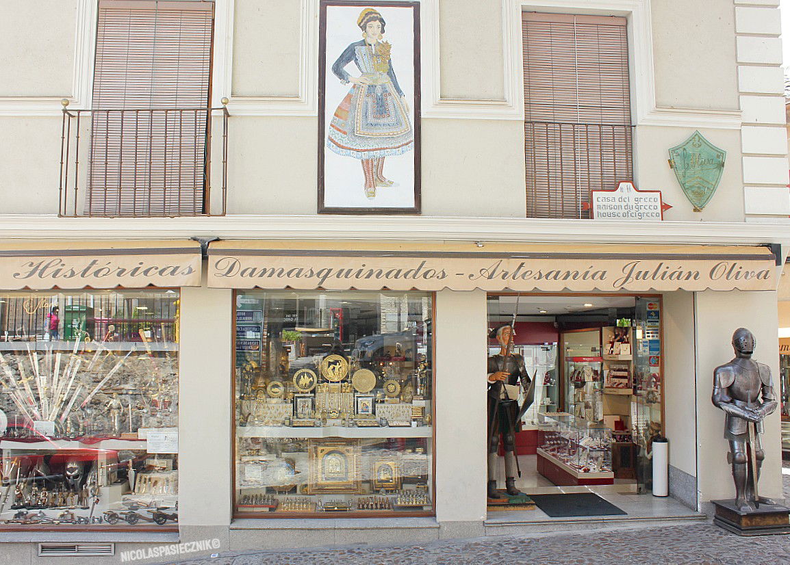 Las casas de recuerdos típicos toledanos contienen piezas de joyería, espadas, cuchillos, escudos, blasones, bijouterie, juegos de ajedrez, banderines y hasta réplicas de armaduras de caballeros medievales. Las figuras del Quijote y Sancho Panza son un verdadero ícono en diferentes puntos del recorrido y selos puede apreciar en formatos tales como esculturas, merchandising y hasta incluso en algunos productos alimenticios o envoltorios de regalos para los turistas.